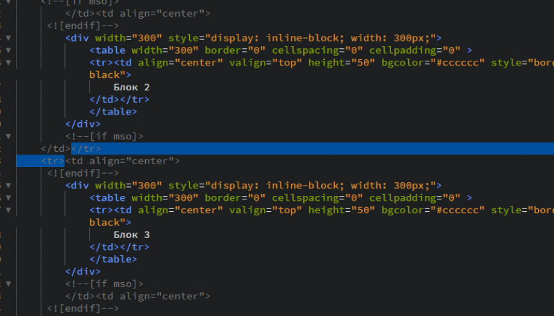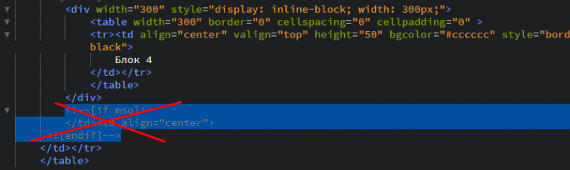 Однако если мы оставим эти ячейки для всех почтовиков, то никакой адаптации у нас не будет. Поэтому используем условие if mso, в которое поместим эти ячейки, чтобы они отображались только в Outlook: