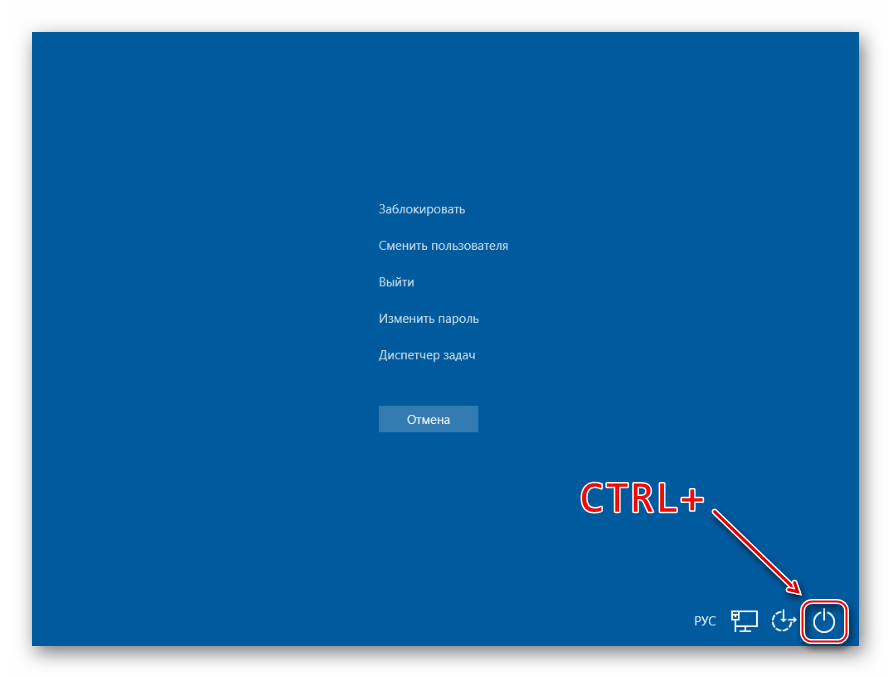 Аналогичным образом совершаем перезапуск системы после нажатия комбинации Ctrl+Alt+Del. Здесь же можно сделать аварийную перезагрузку. Для этого зажимаем Ctrl, а затем иконку выключения. Такой способ рекомендуется выполнять только в крайнем случае, так как все несохраненные данные будут потеряны.