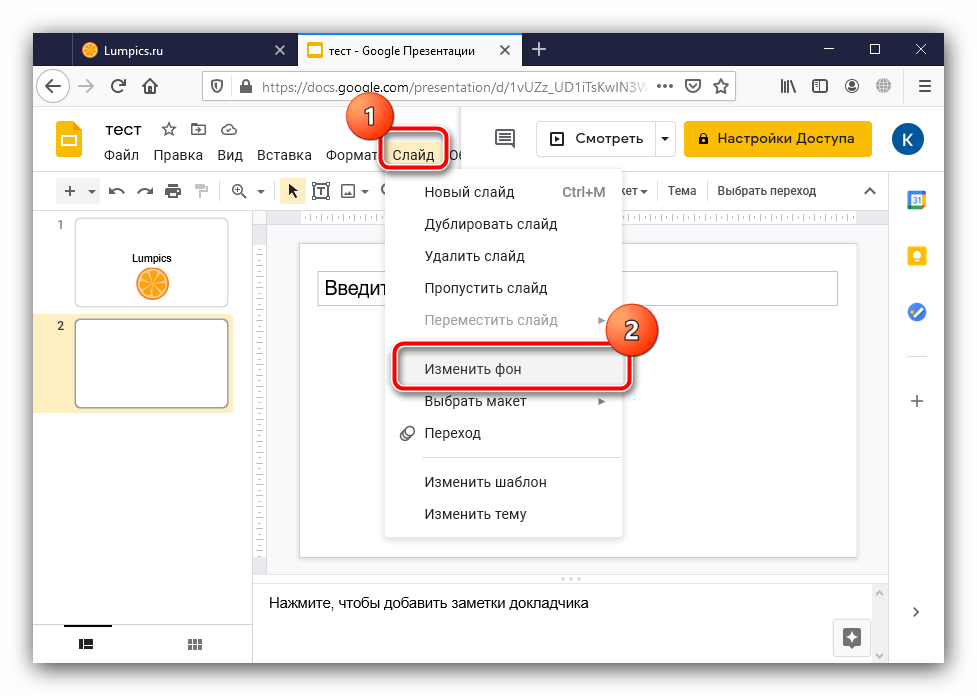 - Запустите Google Slides, откройте требуемый файл и воспользуйтесь пунктами «Слайд» – «Изменить фон».