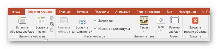 Здесь пользователь может произвести абсолютно любые установки для типа слайдов, который впоследствии будет широко применяться в презентации. Базовые инструменты во вкладке «Образец слайдов» позволяют добавлять новые области для содержимого и заголовки, настраивать визуальный стиль, изменять размер. Все это дает возможность создать действительно неповторимый шаблон для слайда.