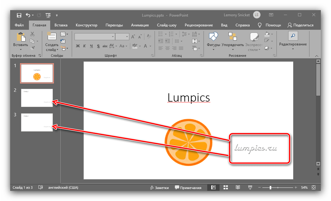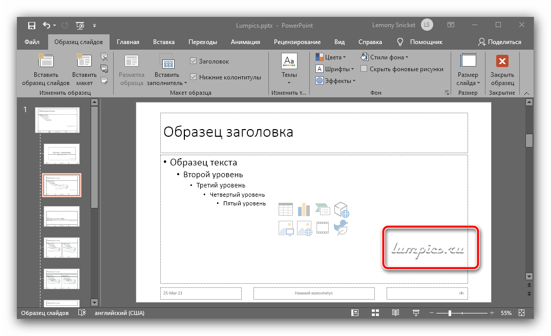 Настройте размер и местоположение знака (обычно их устанавливают в каком-то из незанятых углов) и проверьте остальные слайды образца, чтобы удостовериться, что подпись присутствует на всех.