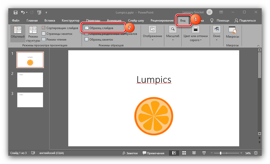 - Откройте нужную презентацию, затем нажмите «Вид» – «Образец слайдов».
