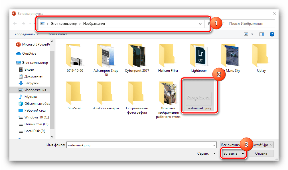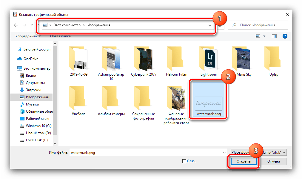 Посредством «Проводника» выберите графический файл с вашим водяным знаком.