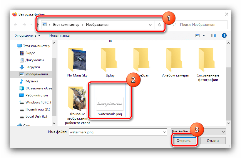 С помощью диалогового окна «Проводника» найдите и выберите файл с вашим водяным знаком.