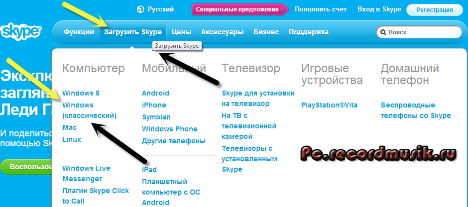 | Виндовс | https://www.skype.com/ru/get-skype/ |