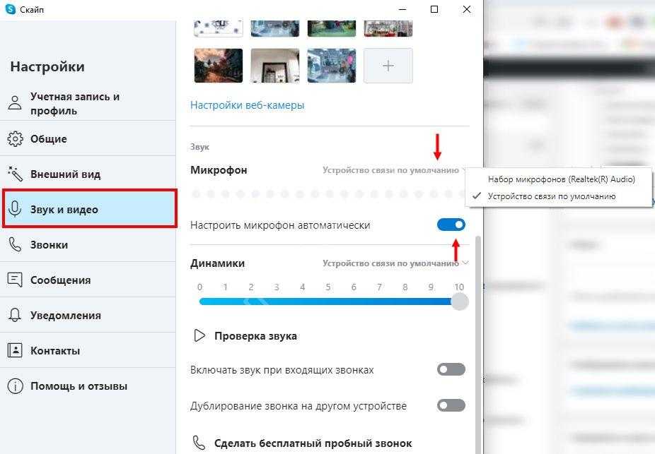 - В блоке «Микрофон» отключите опцию настройки микрофона автоматически. Вы увидите здесь шкалу от 0 до 10. Проговорите что-нибудь в микрофон. Если шкала двигается, значит микрофон воспринимает ваш голос и проблема скорее всего на стороне собеседника.