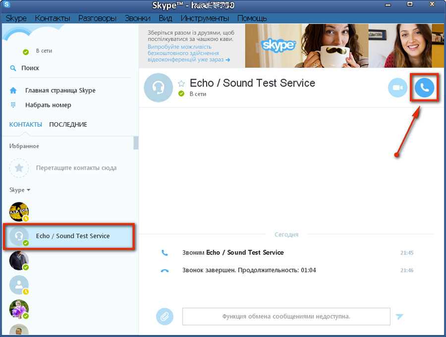 Специально для этой цели у скайпа имеется контакт для тестовых звонков с учетным именем echo123 — «Echo / Sound Test Service». Этот контакт по умолчанию добавляется в список контактов при создании новой учетной записи. Если звуковые устройства настроены, и интернет-соединение в порядке, то можно совершить тестовый звонок, выбрав этот контакт в списке контактов и нажав кнопку «Позвонить».