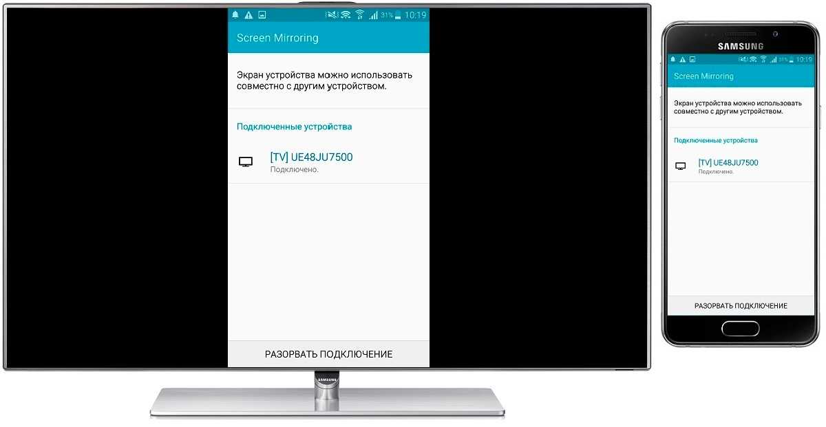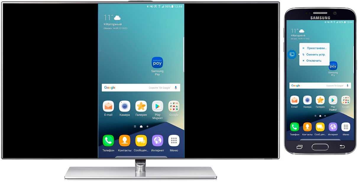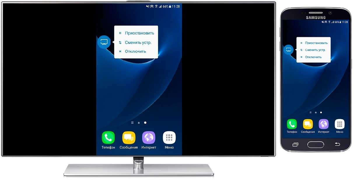 - На экране телевизора отображается только контент. Значки настроек смартфона остаются на экране смартфона.