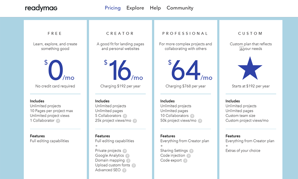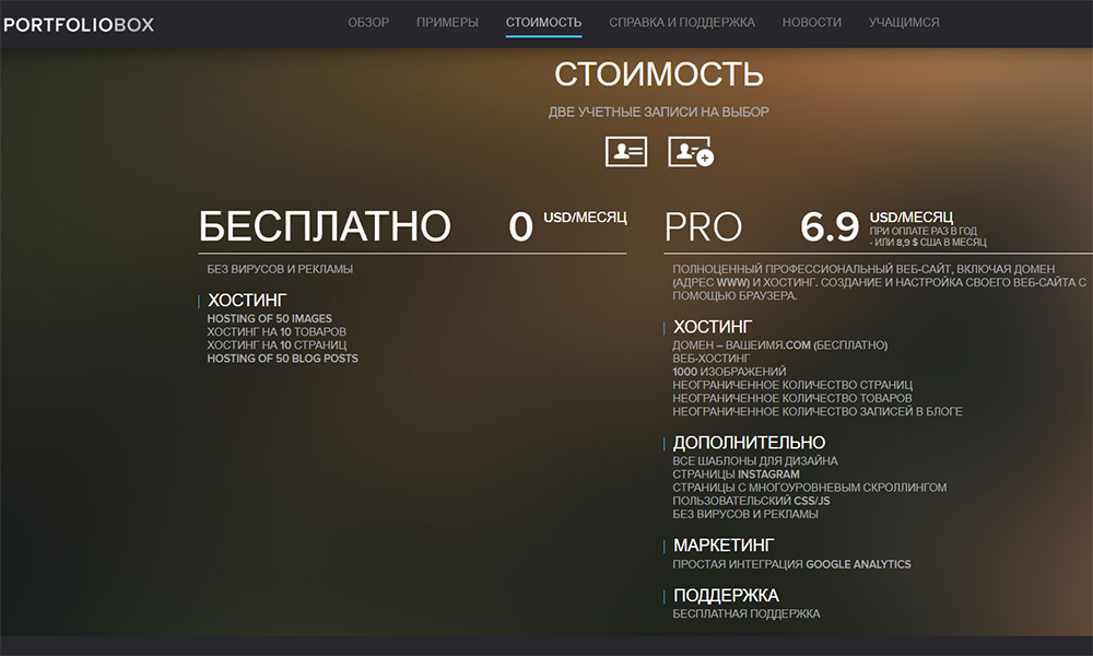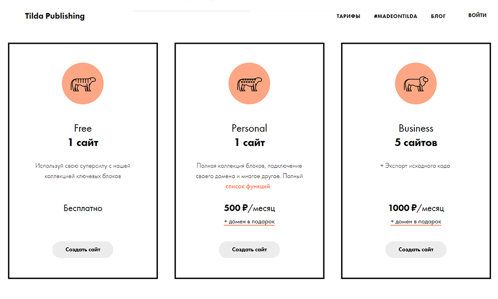 Стоимость: бесплатно для быстрого создания сайта-портфолио с ограниченным функционалом. Персональный сайт с личным доменом стоит 500 рублей в месяц.
