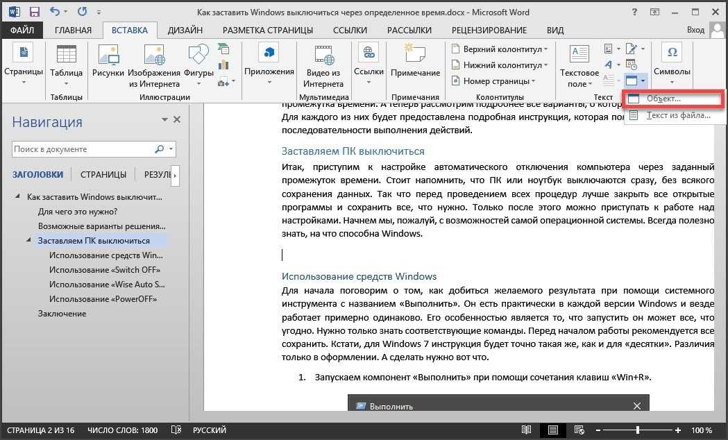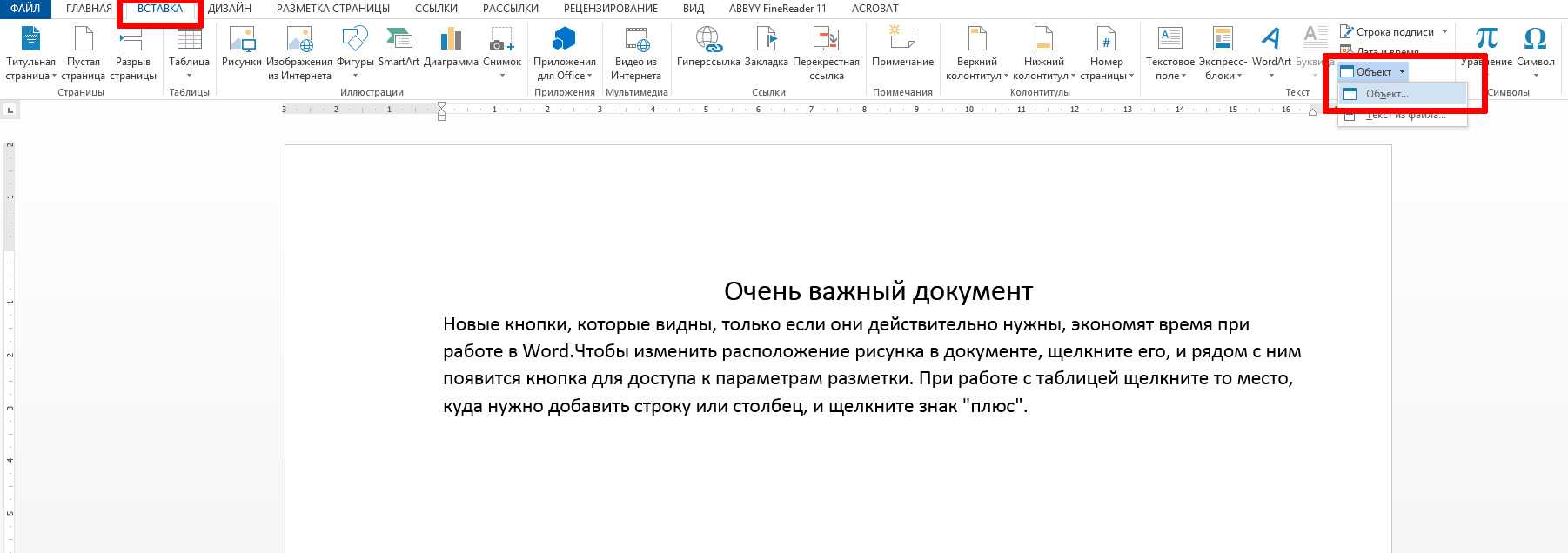 Первым делом открываю “Основной” файл, и ниже “статичного” текста который у меня меняться не будет, ставлю курсор на новую строку. Перехожу на панель “Вставка”, и в группе “Текст” нахожу кнопку “Объект”. Здесь в выпадающем меню выбираю “Объект“.