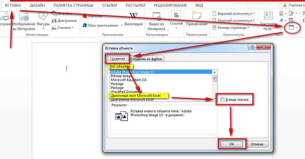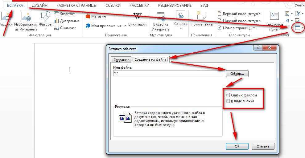 - Установите галочку «В виде значка», если требуется. Значок документа возникнет на месте курсора. Итак, возможно добавлять файл к документу Word.