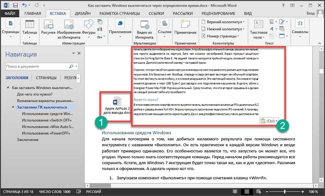 Выполнить вставку готового документа в файл можно посредством одного из двух способов: вставить непосредственно файл в документ или добавить ссылку на него. Наведите курсор на тот участок, где вы бы хотели видеть объект.