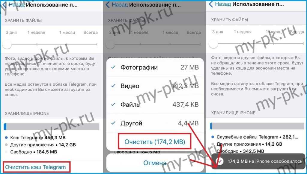 Откроется страница, на которой будет отображена вся статистика занятости памяти телеграмом на айфоне. Здесь же мы сможем просмотреть, сколько именно места занимает бесполезный кэш от одного приложения. Нажимаем «Очистить кэш Telegram». Подтвердите удаление, нажав на соответствующую кнопку.