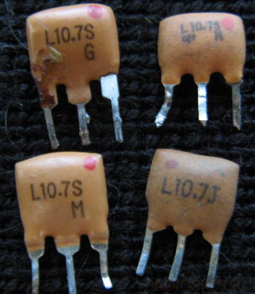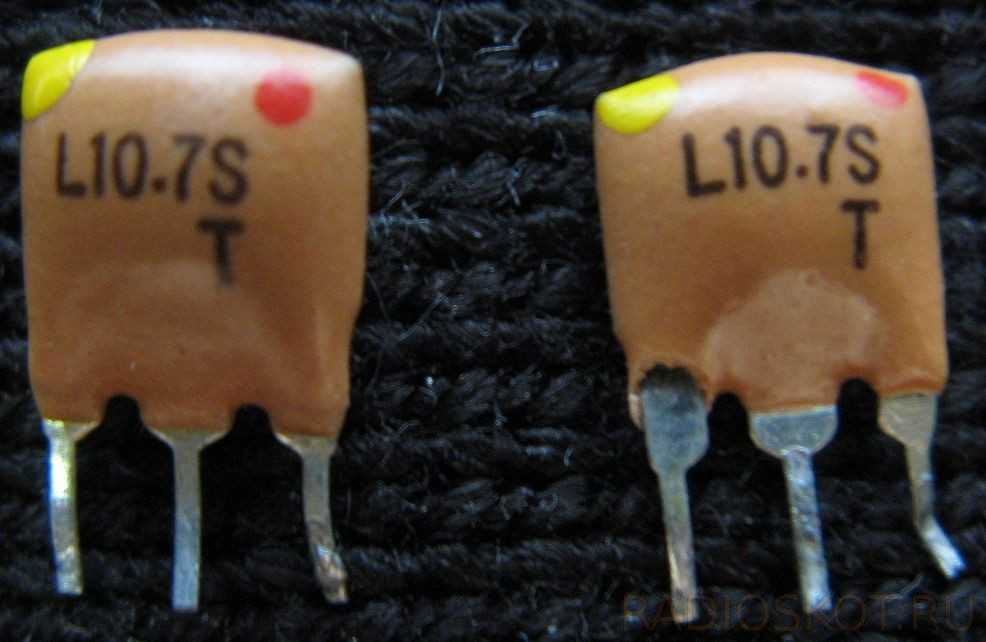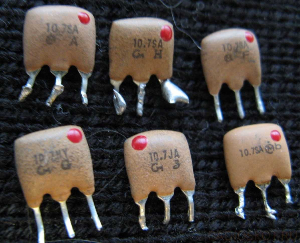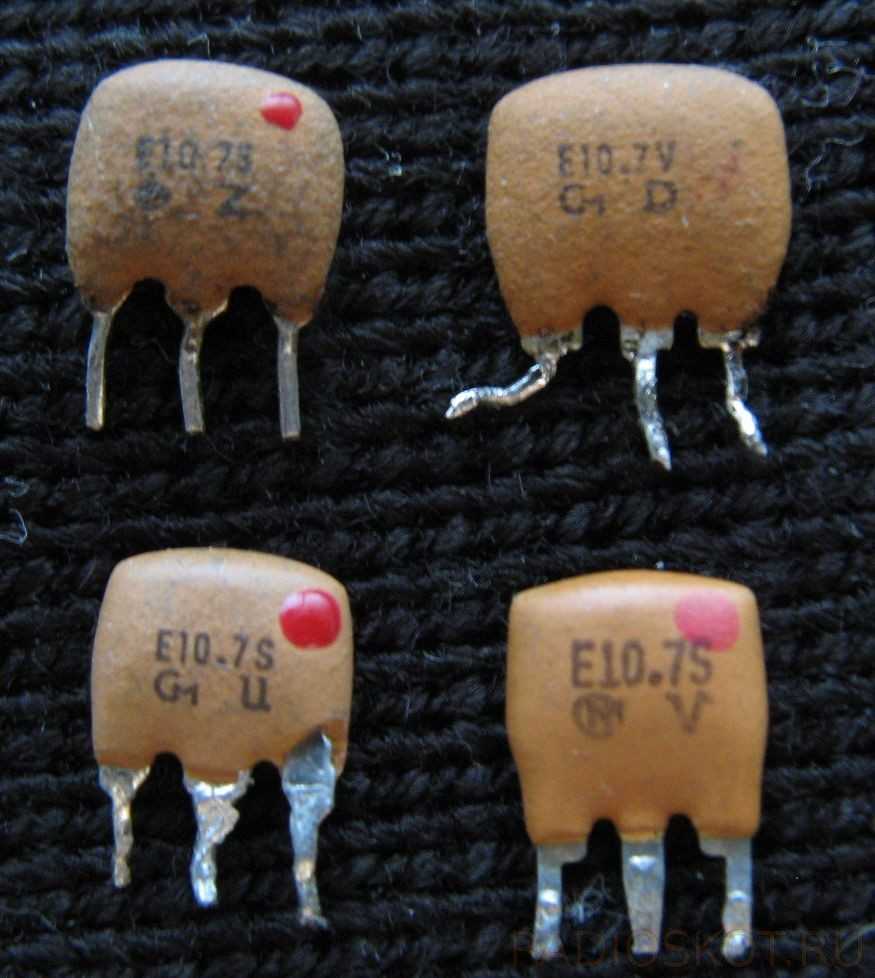 Вот эти с буквой «Е» дают самый качественный звук. Найти их бывает непросто. Вообще качество пьезофильтров отражается только на высоких частотах звука. Влияния на средние и низкие частоты практически не чувствуется. Именно с этими пьезофильтрами звук наиболее приближен к естественному. Обязательно надо смотреть на цвет точки, отмеченной краской. Красная или ее нет это частота точно 10,7 МГц. Другие цвета – частоты несколько отличаются от 10,7 МГц.