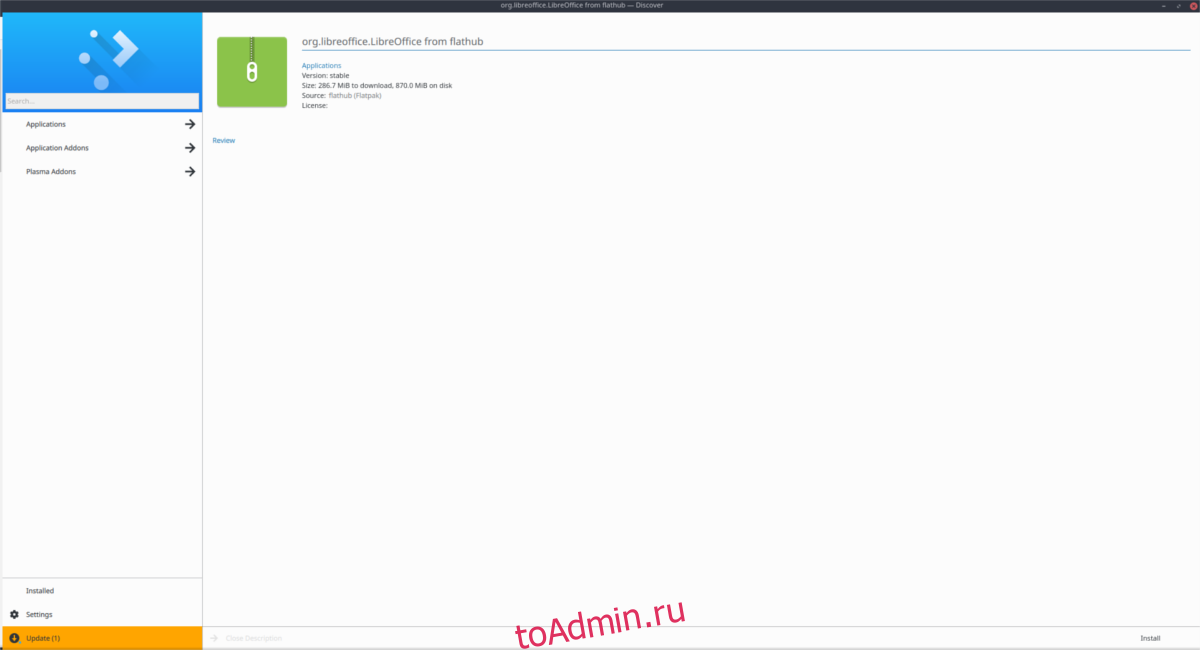 Нажмите кнопку «Установить» и введите свой пароль, чтобы получить Libre Office для Linux через Flatpak.