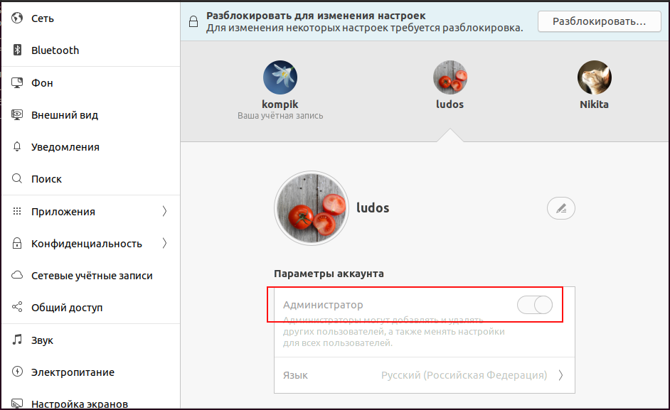 Открыв графическую оболочку управления пользователями, мы обнаруживаем, что наш обычный ludos стал администратором, а так как он входит еще и в группу sudo, то может пользоваться и привилегиями root, в чём мы и убеждаемся, войдя в учетную запись ludos, открыв терминал и запросив разрешения root.