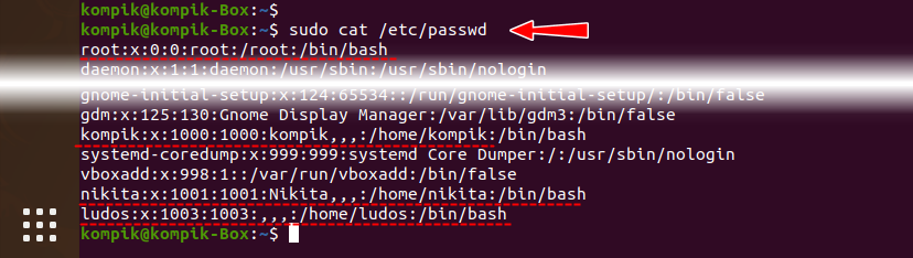 Чтобы просмотреть содержимое этого файла выполните команду sudo cat /etc/passwd.