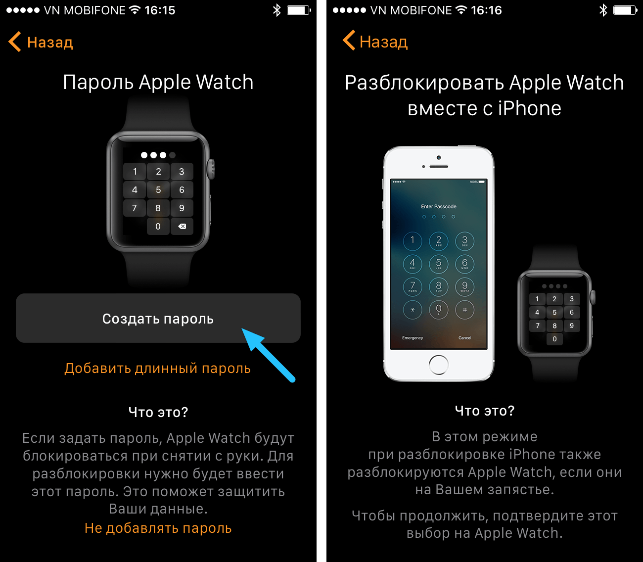 4.4 Создайте пароль. Если нажать «Создать пароль» или «Добавить длинный пароль» на iPhone, можно создать личный код с использованием Apple Watch. Затем необходимо решить, будет ли iPhone автоматически снимать блокировку с часов.