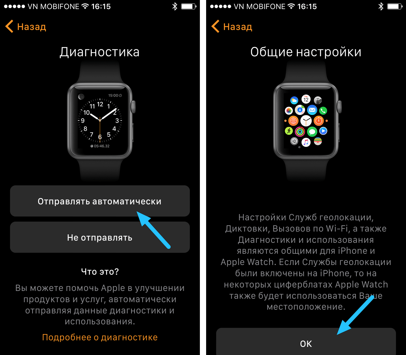 4.3 Проверьте настройки. Настройки iPhone, заданные на экранах «Диагностика и использование», «Службы геолокации» и Siri, будут передаваться на Apple Watch и наоборот. Поэтому если меняются настройки этих служб на одном устройстве, они будут обновлены и на втором.