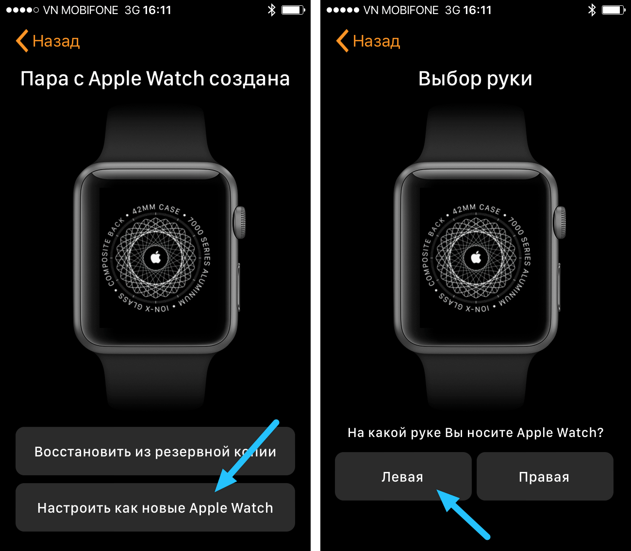 4.1 Настройка и выбор руки. Если это ваши первые часы, то нажмите «Настроить как новые Apple Watch». Если настройка выполнялась раньше, можно нажать «Восстановить из резервной копии» и следовать инструкциям на экране. Затем нажмите «Левая» или «Правая» на iPhone, чтобы выбрать руку.
