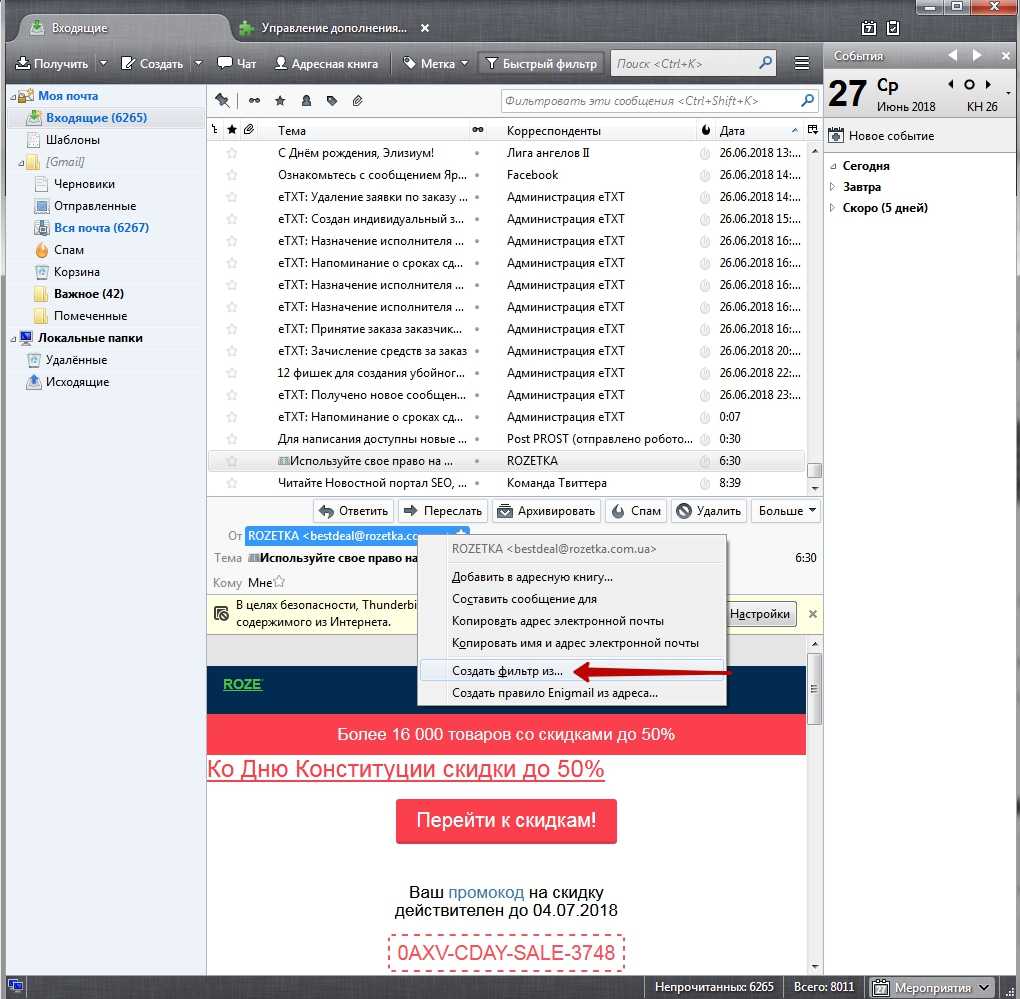 Чтобы сделать это, достаточно в сообщении кликнуть правой кнопкой мыши по адресу отправителя и в контекстном меню выбрать пункт «Создать фильтр из…».