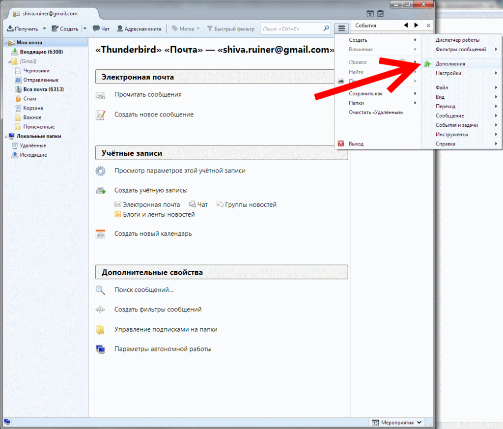 В Mozilla Thunderbird темы представлены в виде отдельных дополнений, которые необходимо скачивать из интернета. Сделать это можно без посещения сторонних ресурсов сразу в окне программы. Для этого необходимо кликнуть по пункту «Дополнения» в главном окне.
