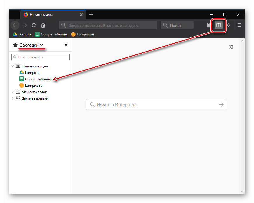 - Щелкните по кнопке «Показать боковые вкладки», убедитесь, что открыты «Закладки» и просматривайте сохраненные страницы интернета, упорядоченные по папкам.