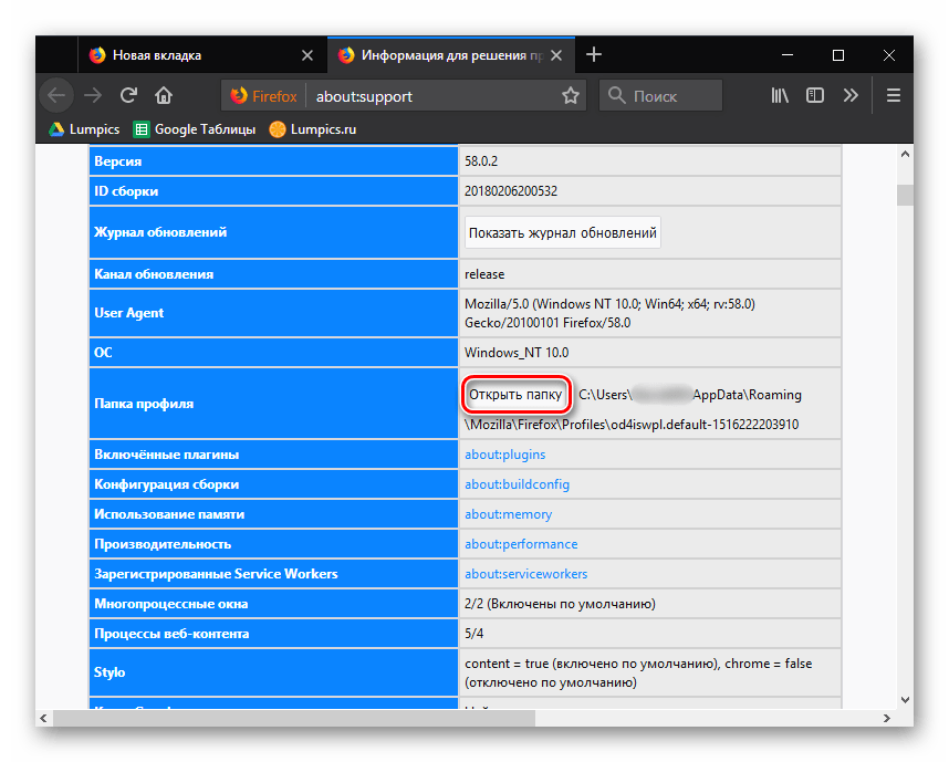 Следует кликнуть по кнопке главного меню программы и перейти по пути «Справка» — «Информация для решения проблем». Напротив пункта «Папка профиля» есть кнопка «Открыть папку» Нажав на нее, вы попадете в целевой каталог, где увидите требуемые файлы.