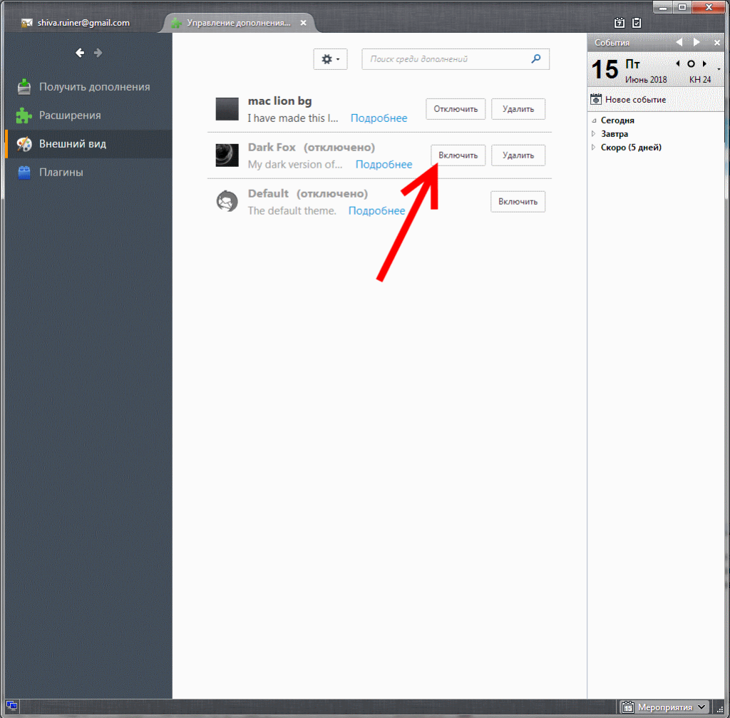 Скачанная тема применяется автоматически. Если вы загрузили несколько тем, для переключения между ними необходимо перейти во вкладку «Внешний вид» меню управления дополнения и нажать кнопку «Включить» напротив названия темы, которую вы хотите применить.