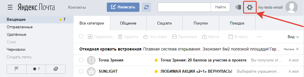 Перейдите в настройки почты Яндекса, кликнув на шестерёнку справа вверху.