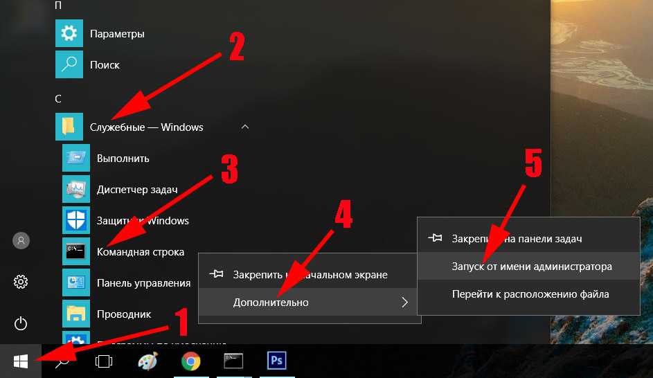 Открываем командную строку. Открыть её необходимо от имени администратора. Для этого зайдите в «Пуск», «Служебные». Находим «Командную строку» и жмем ПКМ на ней. Выбираем «Дополнительно», «Запуск от имени администратора».