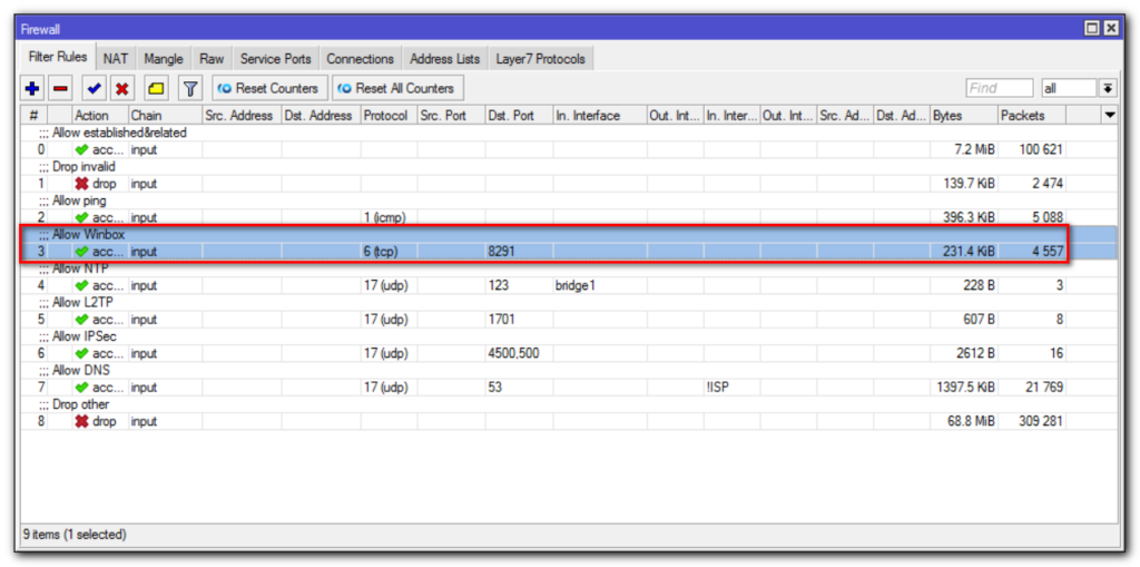 В текущей конфигурации Mikrotik удаленный доступ предоставлен всем желающим, что негативно сказывается на безопасности. В современном мире смена стандартного порта, на котором работает сервис (например, Winbox) является слабой защитой. Как обезопасить роутер от сканирования и проникновения мы рассмотрим в статье MikroTik настройка firewall.