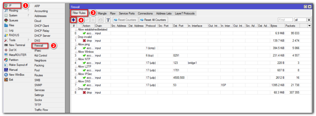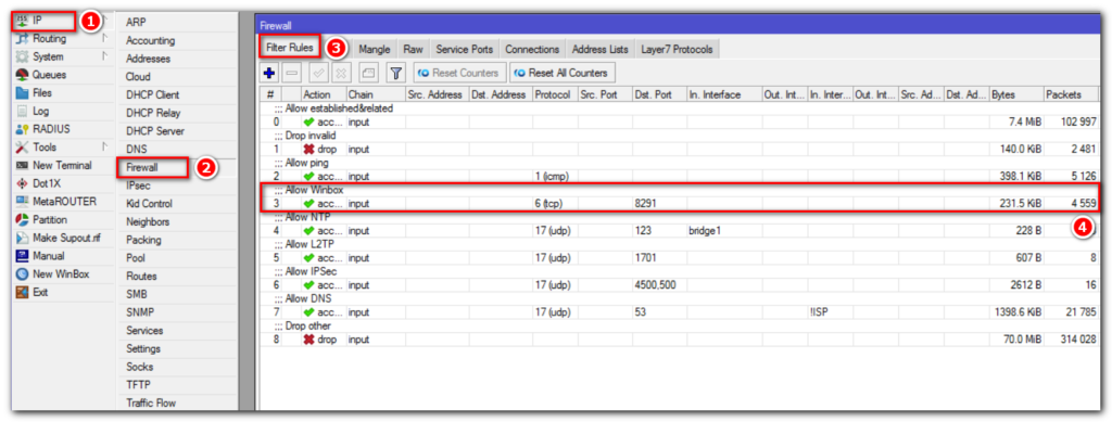 Чтобы подключиться к Микротику через Winbox, нужно в firewall открыть порт 8291. Для этого запустим фирменную утилиту (которую можно скачать с официального сайта) и перейдем: