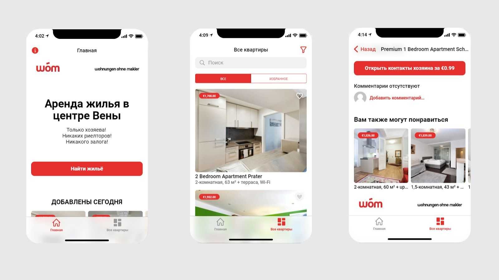 WOM — это площадка, которая помогает найти и забронировать жилье в центре Вены напрямую у владельца. Если уже пользовались Airbnb, то и в WOM разберетесь. У приложений даже схожие интерфейсы — чтобы пользователи не переучивались и заново не привыкали к новому меню.
