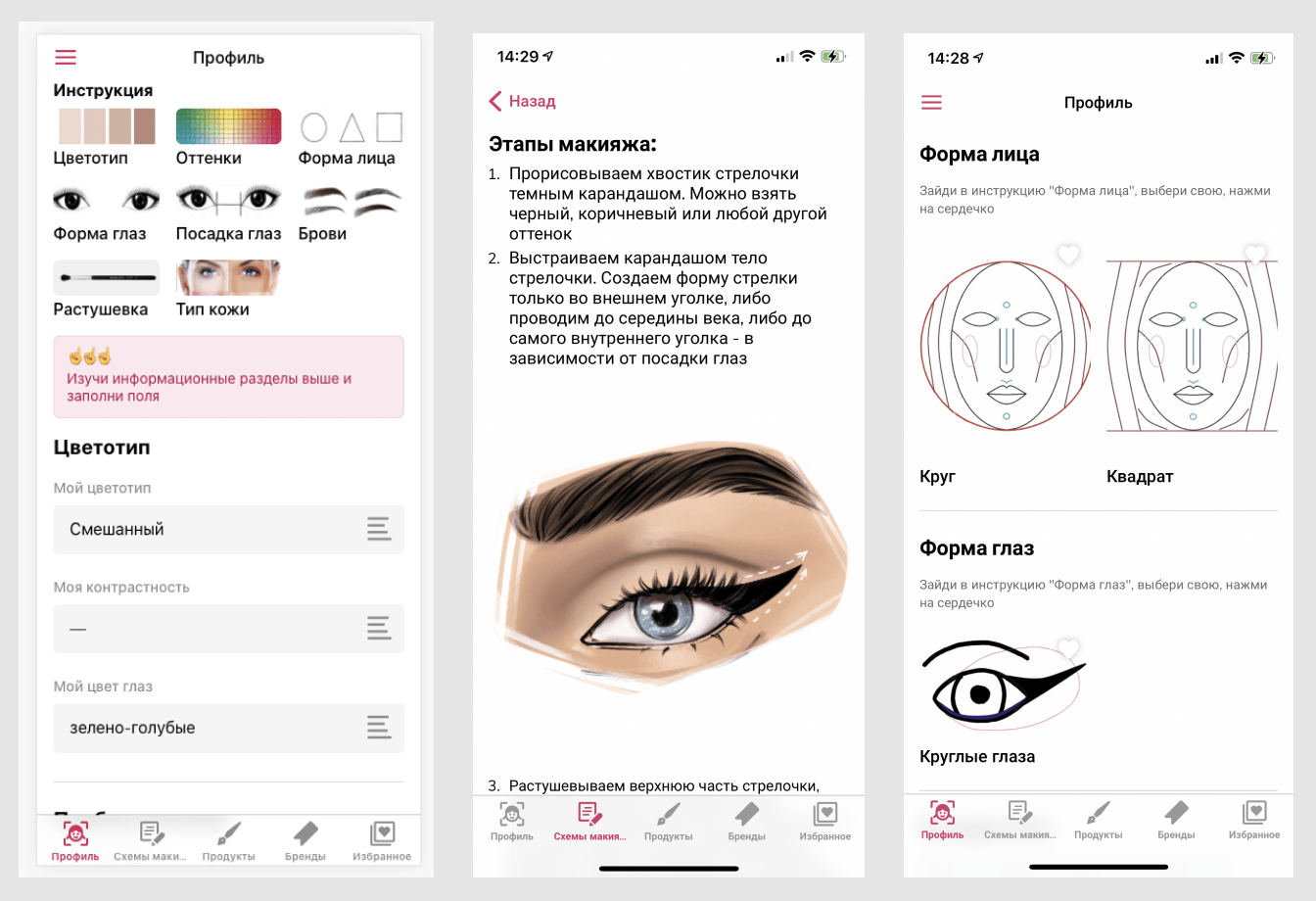 Приложение интегрировано с ЮKassой, Integromat и GetCourse, можно выбрать свой цветотип, форму лица и глаз, найти инструменты и средства для макияжа, а также получить советы — где их лучше купить, чтобы не попалась подделка.