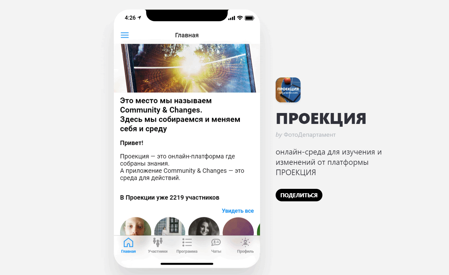 «Проекция» — приложение для учеников одноименной онлайн-фотошколы. В нем ученики делают домашние задания, получают оценки и общаются друг с другом в тематических чатах. Администраторы приложения размещают обучающие материалы и упражнения через панель управления. Можно оформить подписку и получить доступ к закрытым материалам и курсам.