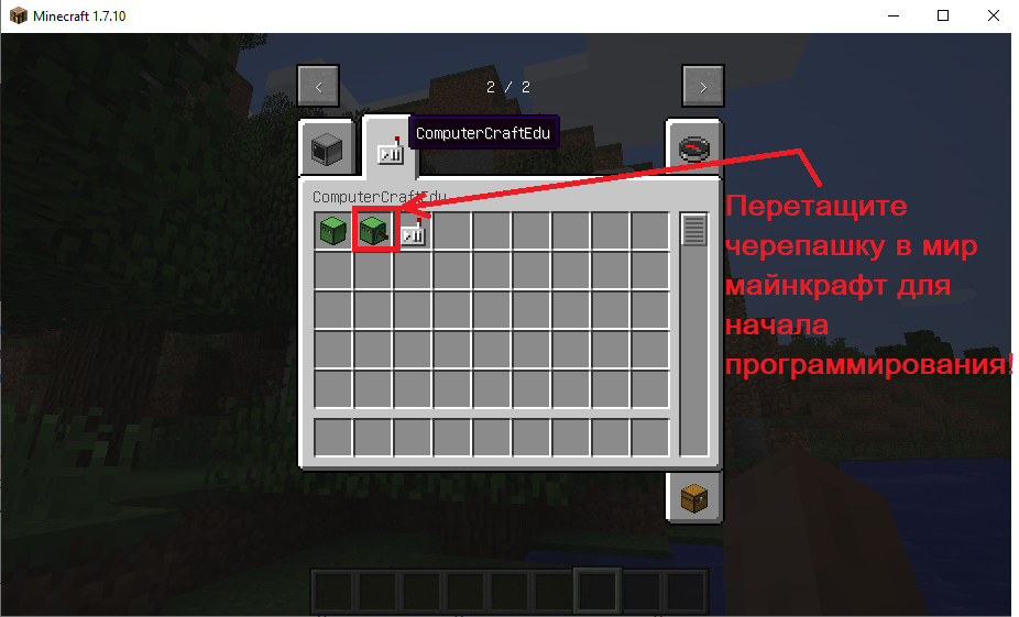 При первом запуске игры появится главный персонаж, а вовсе не черепашка. Наверняка покажется, что сделали что-то не так! Но на самом деле все правильно, просто вы еще не добавили своего творца в мир Майнкрафт. Откройте Инвентарь (достаточно нажать латинскую E), перейдите на вторую закладку и нажмите на белый «конвертик» — Computer Craft Edu. Там то и спрятался исполняющий написанный код персонаж: