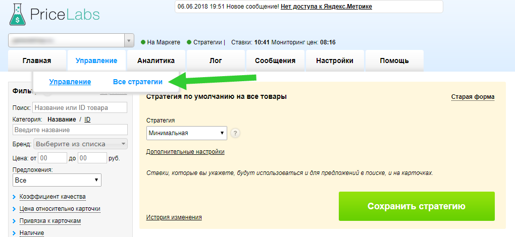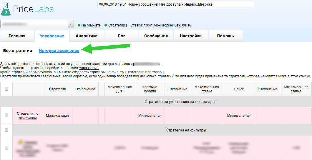 Если с «Управлением» все понятно, там вы выставляете ставки, создаете фильтры, то вот в раздел «Все стратегии» настоятельно рекомендую заходить почаще. С помощью анализа воронки фильтров можно обнаружить перекрытие фильтров, чтобы ставки на товары назначались корректно. Также есть полезная вкладка «История изменений».