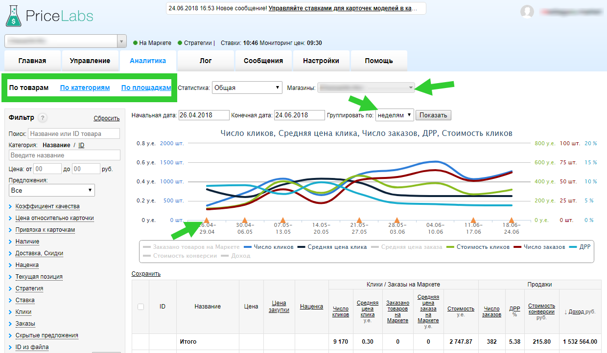 Отчет очень гибкий, можно посмотреть статистику по товарам, категориям или площадкам за любой период. Есть возможность различной группировки для удобства. Важный момент — всегда смотрите, какой магазин у вас отображается в списке (указано стрелкой). В последнее время, если у вас несколько магазинов, то в основном списке по умолчанию отобразится статистика магазина, который вы просматривали ранее, а не того, что выбрали самостоятельно.