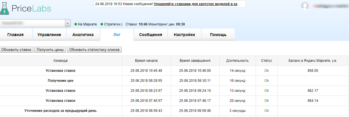 4. «Лог» и «Сообщения». В разделе «Лог» вы видите какие команды и в какое время выполнялись, а также их статус.