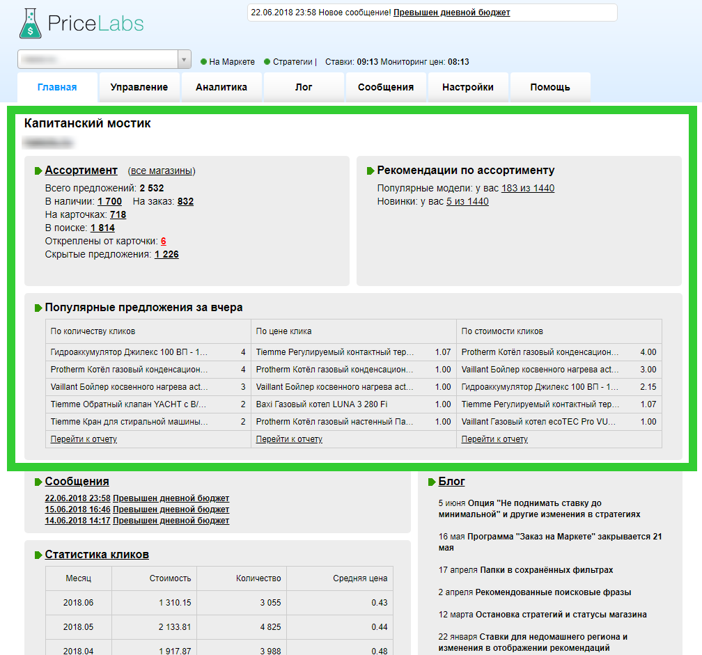 1. «Капитанский мостик» — отправная точка в путешествии по PriceLabs. Все основные показатели в одном окне. Как аккаунт-менеджеру, работающему с рекламными бюджетами клиентов, на «Капитанском мостике» мне прежде всего важны (для быстрого просмотра) первые три блока: ассортимент, рекомендации по ассортименту и популярные предложения за вчера (см. скриншот). Статистику кликов удобнее смотреть в отдельном разделе.
