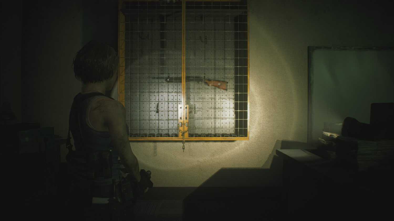 В главном зале находится небольшое отделение полиции. Один из столов принадлежит Леону. Однако он заблокирован двумя замками. Как открыть стол Леона — сейчас узнаете.