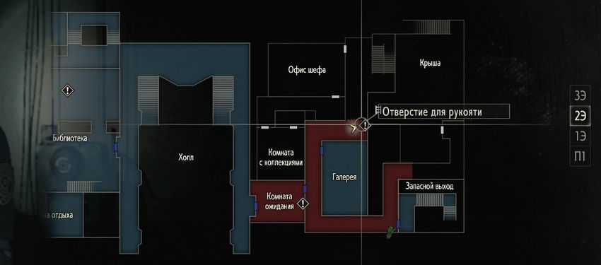 Находясь в холле, поднимайтесь на второй этаж и войдите внутрь «Комнаты ожидания» (пройдите через неё). Сразу на выходе из комнаты поворачивайте в левую сторону и двигайтесь дальше по коридору. В конце нужно будет вставить в двери рукоять. Так откроется доступ к лестнице, которая ведёт наверх.