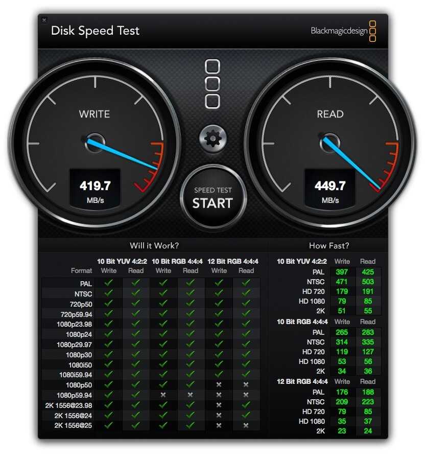 Ниже приведены два основных спидометра Это будет работать и Как быстро панели результатов. Это будет работать Панель включает в себя список распространенных видео форматов, начиная от простого PAL и NTSC до 2K форматов. Каждый формат на панели имеет несколько вариантов глубины цвета в битах и отдельные флажки для чтения или записи. При выполнении теста панель заполняется зелеными галочками для каждого формата, глубины и скорости чтения и записи, которые тестируемый том может поддерживать для захвата и воспроизведения видео.