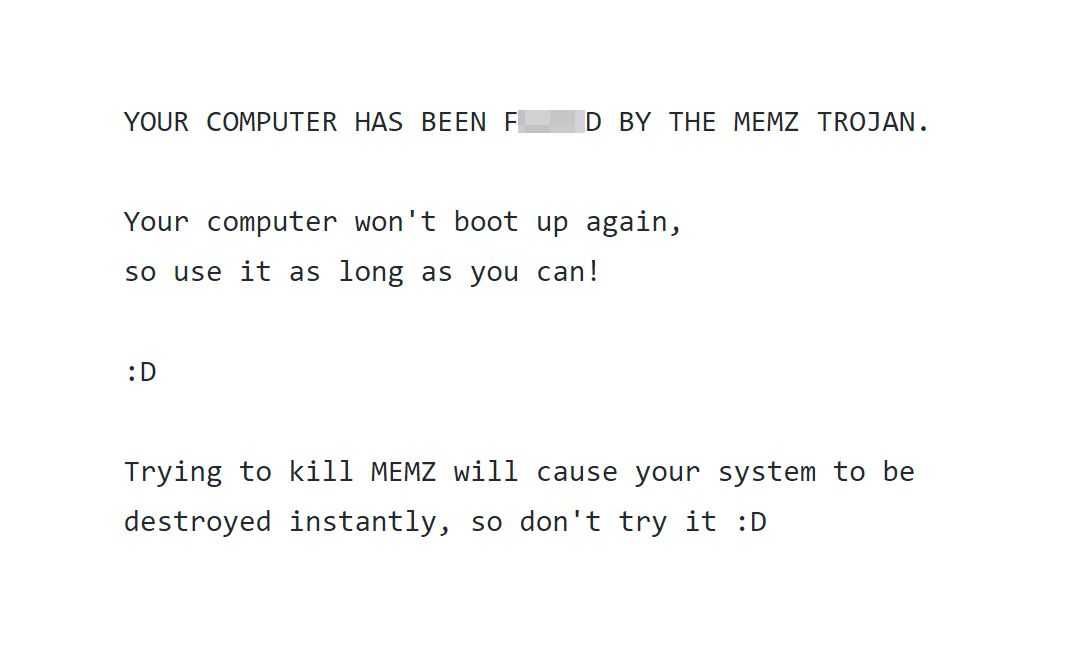MEMZ Trojan может сделать интересную и очень разрушительную вещь: перезаписать первые 64 КБ жесткого диска. Это означает, что ваша основная загрузочная запись будет затронута, и вам понадобится продвинутое устранение неполадок.