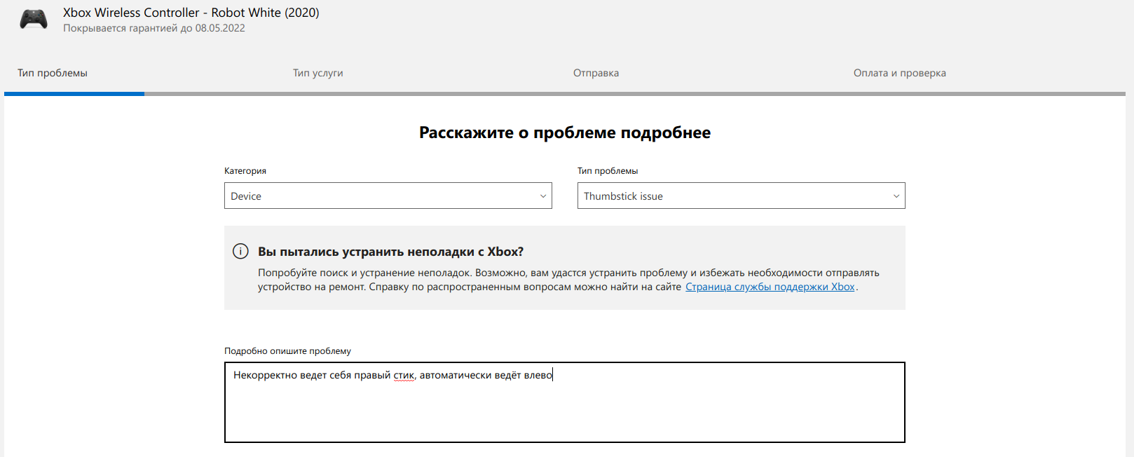 Из-за того что моя консоль была приобретена из-за рубежа обратиться в розничную сеть я не мог, выхода два: обратиться в магазин где я приобретал консоль (отправить в Германию всю приставку и ждать много дней) или обратиться напрямую в Microsoft, можно обратиться в поддержку по телефону (перейдите на сайт и закажите обратный звонок) или заполнить всё на сайте.