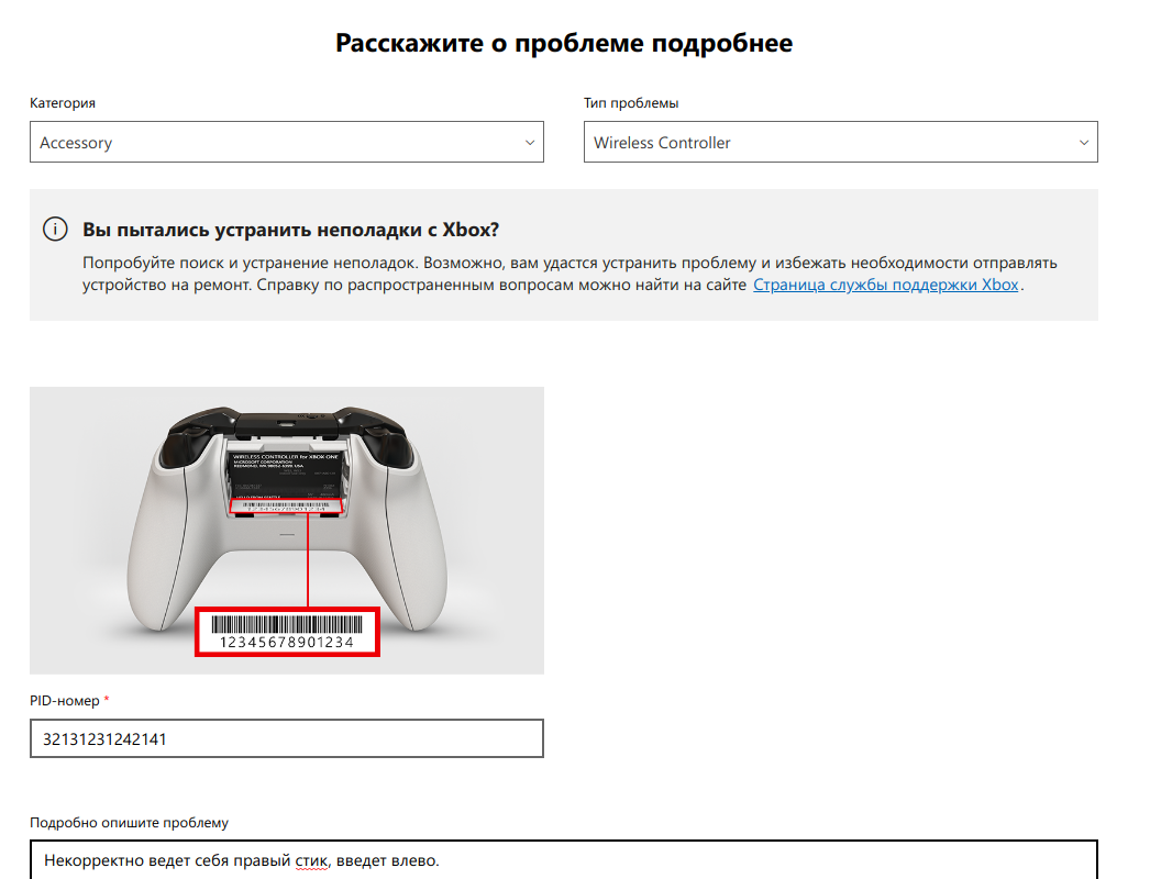 Выбираем категорию Accessory (если сломался геймпад) и тип проблемы Wireless Controller и вводим серийный номер геймпада не забыв описав проблему и нажимаем далее.