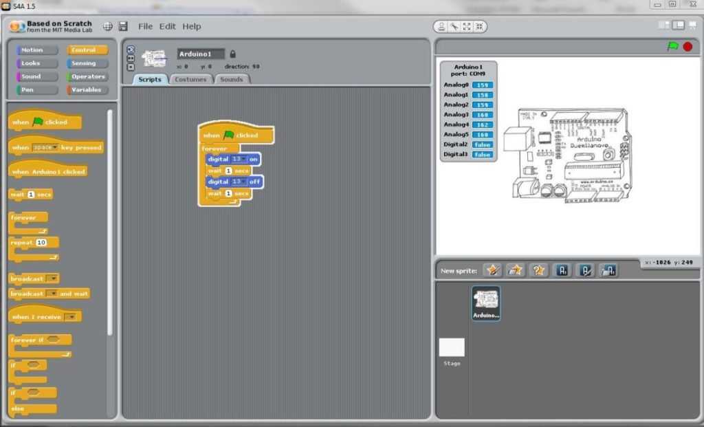 Больше всего, пожалуй, он похож на Lego. По крайней мере, принцип тот же: это объектно ориентированная среда, в которой программы собираются из деталей, разноцветных и ярких. Эти детали можно перемещать, видоизменять, заставлять взаимодействовать различным образом. Основа Scratch — блоки команд, таких как сенсоры, переменные, движение, звук, операторы, внешность, перо, контроль и пр. Встроенный графический редактор дает возможность нарисовать любой объект. Не прошло и пяти лет с момента создания Scratch, как возник проект Scratch для Arduino (сокращённо — S4A), позволяющая программировать ПЛК Arduino.