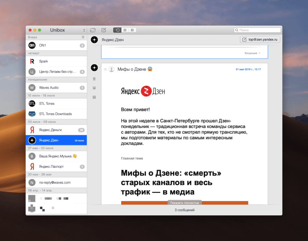 Этот клиент хорош в первую очередь своим интерфейсом. В боковой панели стандартных почтовиков отображаются ящики и отдельные письма. В Unibox там отображаются ваши собеседники независимо от того, реальные это люди или сервисы по рассылке. Такой подход упрощает работу с почтой – больше не нужно вводить в поиск имена или как-то помечать отдельных людей. Все они отображаются единым списком.