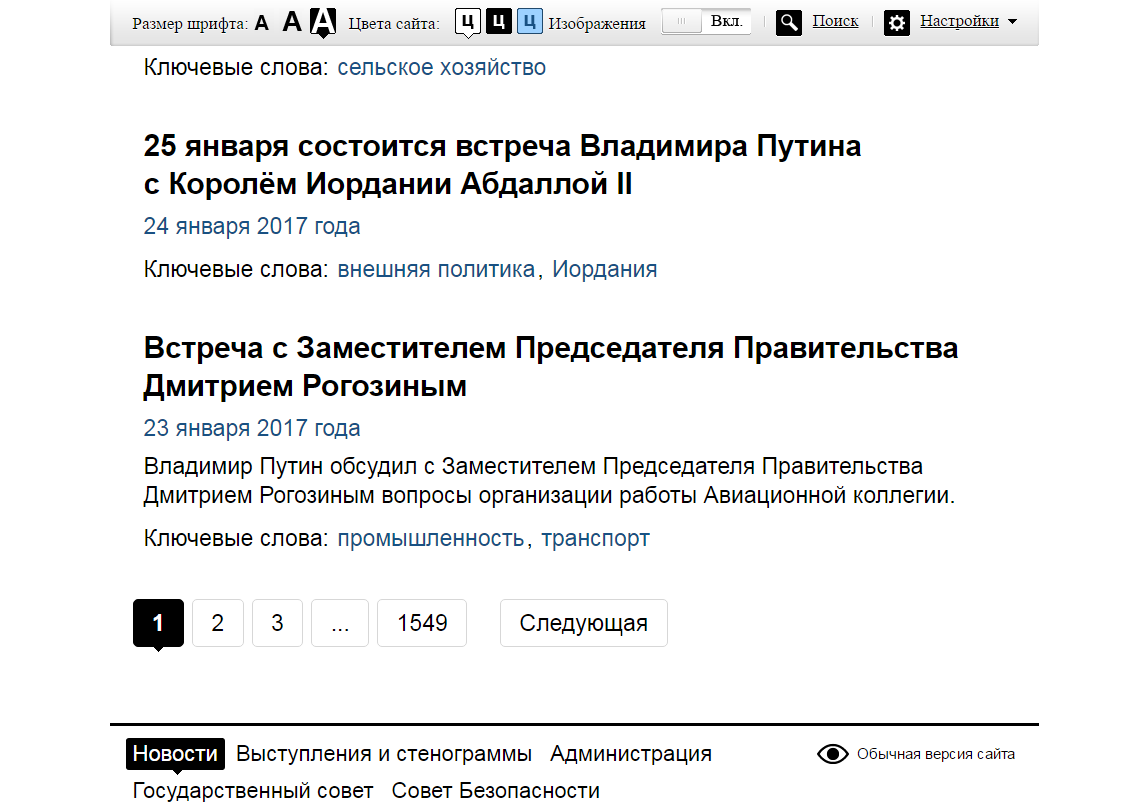 На сайте президента РФ есть версия для людей с ограниченными возможностями. Интерфейс предлагает изменения размера и разрядки (расстояния между буквами) шрифта, а строки не превышают 80 символов. |